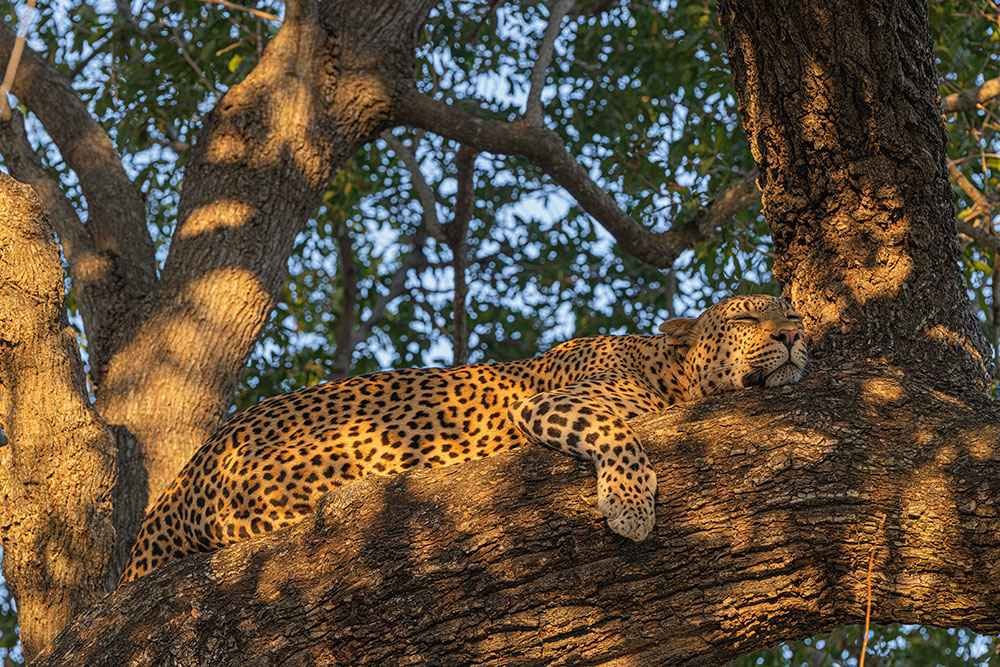 - Leopards on trees, their golden coats glowing in the sun.